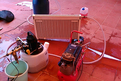 Esiteks täidetakse vooluring loputusvedelikuga. Kui töötav aine on külmakindel, tehakse esialgne rõhukatse veega ja teine lahusega.