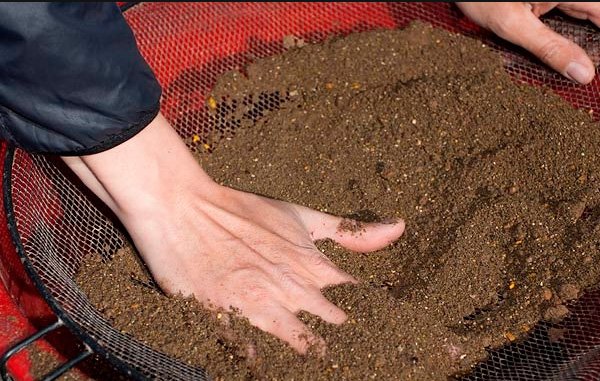 Foto 2. Savi sõelumine läbi metallsõela. Peate seda peopesaga vajutama, et kõik osakesed ühtlaselt läbiksid võrgu.