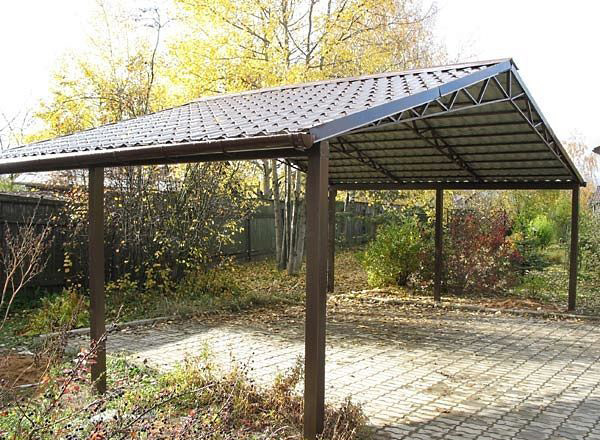 תמונה 1. סככת עצים גדולה בצורת חופה בדאצ'ה, הגג עשוי יריעות גלי.