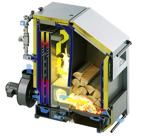 לאחר הטעינה וההצתה, הדלק משחרר גזים דליקים. הם נכנסים לתא עם מחליף החום דרך החור, ומחממים אותו. העשן פולט אנרגיה ויוצא דרך הצינור, ומים חמים נכנסים לרשת החימום.