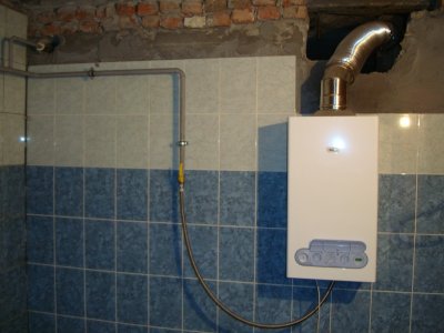 תמונה 3. דוד גז המותקן על הקיר עם תא בעירה פתוח. הוא מצויד בארובה עשויה צינורות פלדה.
