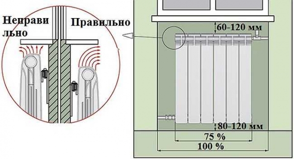 תמונה 1. דיאגרמות של התקנה נכונה ושגויה של רדיאטור: מרחק קטן מדי מהסוללה לאדן החלון מפחית את העברת החום.