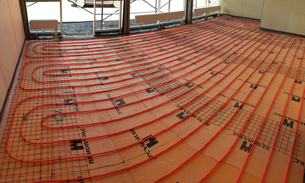 תמונה 1. התקנת רצפות מים חמים עם צינורות פוליאתילן צולבים אדומים בתוך הבית.
