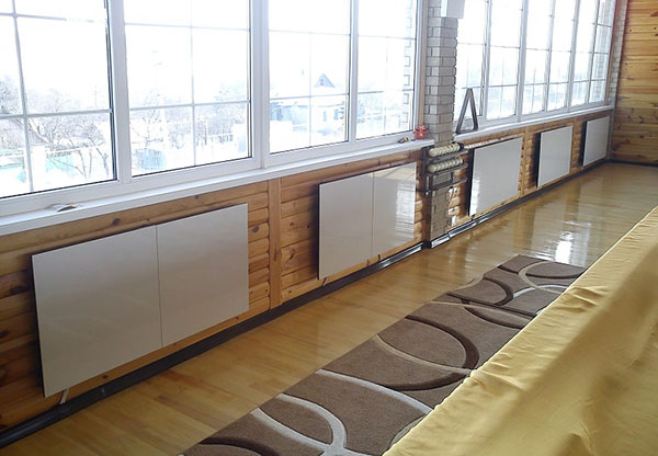 דרך יעילה ובלתי מורגשת להתחמם בחדר קר. מכשירי חימום מוסתרים סביב היקף החדר תחת פסים דקורטיביים.