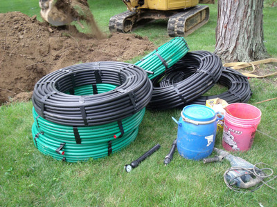 תמונה 1. קבירת פיר חימום גיאותרמי אנכי. צינורות עטופים בספירלה מורדמים עמוק לתוך האדמה.