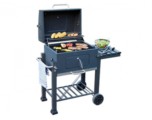 גריל גדול על מעמד עם גלגלים. מידות של צלייה: 1.14 x 0.68 x 1.07 מטרהסט כולל קערת פחמים מפלדה עמידה בחום, מנחת אוויר, גלגלים, קונסולה צדדית, שתי רשתות עבודה.