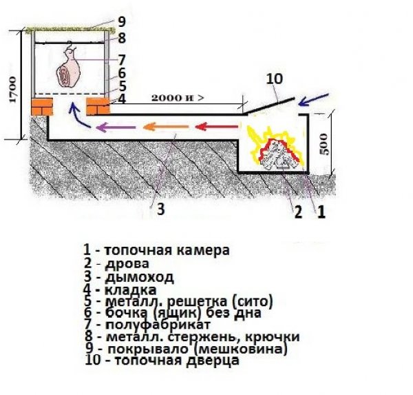 תמונה 1. תרשים של בית מעשנה פשוט עשוי מחבית מתכת עם ארובה המונחת מתחת לאדמה.