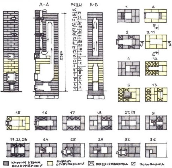 גזים חמים נכנסים לבארות ויורדים כמעט עד הרצפה, פולטים חום לקירות הלבנים, ואז עולים ונכנסים לצינור. מספרם של כאלה זרימת עשן ייתכן מ-2 עד 8.