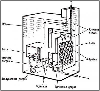 בעת בניית תנור כזה, הדוד מותקן מעל תיבת האש באזור מכסה המנוע הראשון — המים מתחממים על ידי גזים חמים העוטפים את דפנות המתכת.