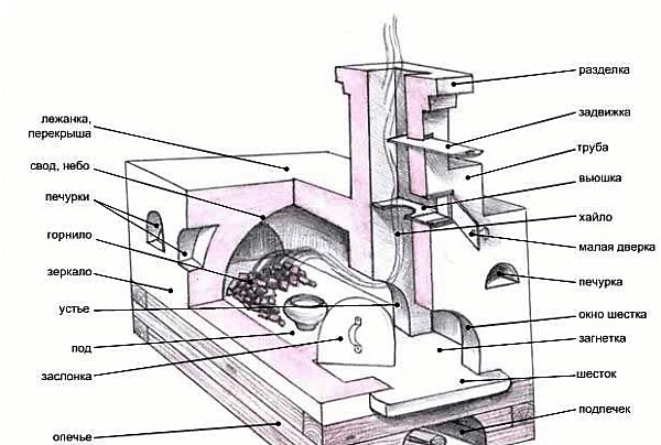 תמונה 1. תרשים של מבנה תנור עצים רוסי טיפוסי, כל האלמנטים העיקריים של העיצוב מסומנים.