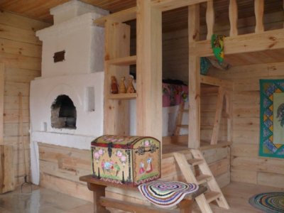 תמונה 2. תנור רוסי, מעוטר באריחים דקורטיביים. המכשיר ממוקם בפינת החדר.