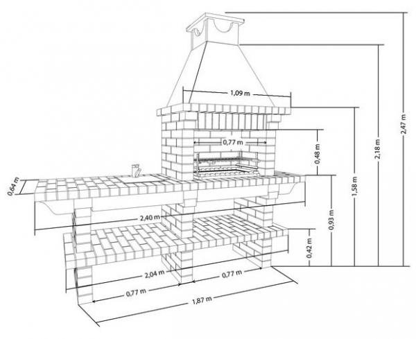 תמונה 2. סכימה של בניית תנור ברביקיו מלבנים פינתי עם מידות. המתחם כולל גם כיריים וכיור.